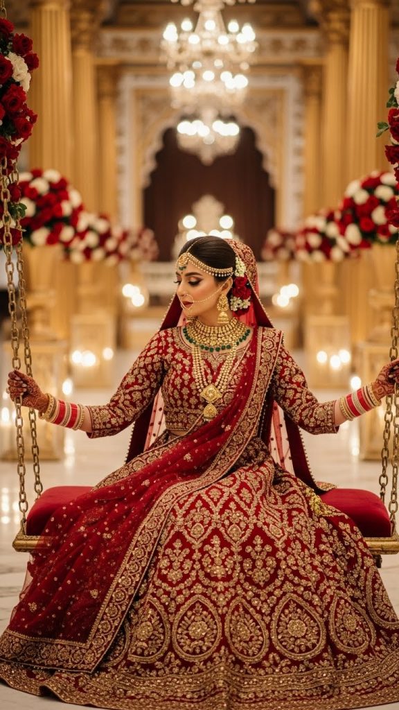 Nothing symbolizes Pakistani bridal grace like a deep red lehenga. Paired with golden zardozi embroidery and a heavily worked dupatta, this look reflects tradition and royalty. It is perfect for brides who love a timeless bridal aura.