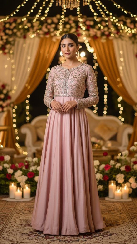 Silk naturally shines — an A-line silk dress with subtle stone embellishments creates a refined, royal look. This style works beautifully for engagement parties or Eid gatherings.