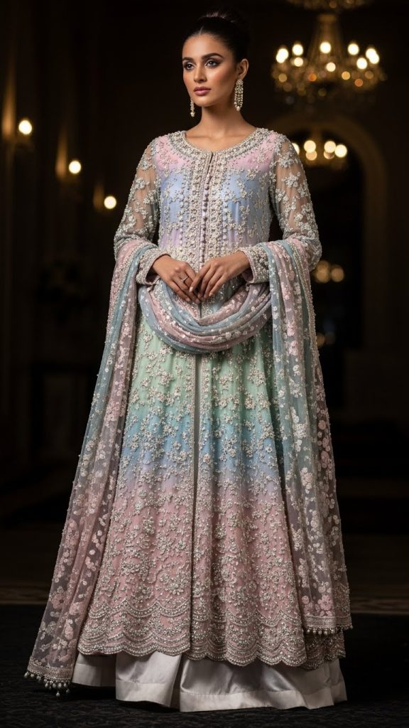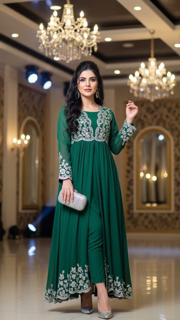 Cape-style dresses are trending across Pakistan’s fashion scene. A fitted inner dress paired with a sheer embroidered cape offers a sophisticated silhouette that blends modesty with fashion-forward styling.