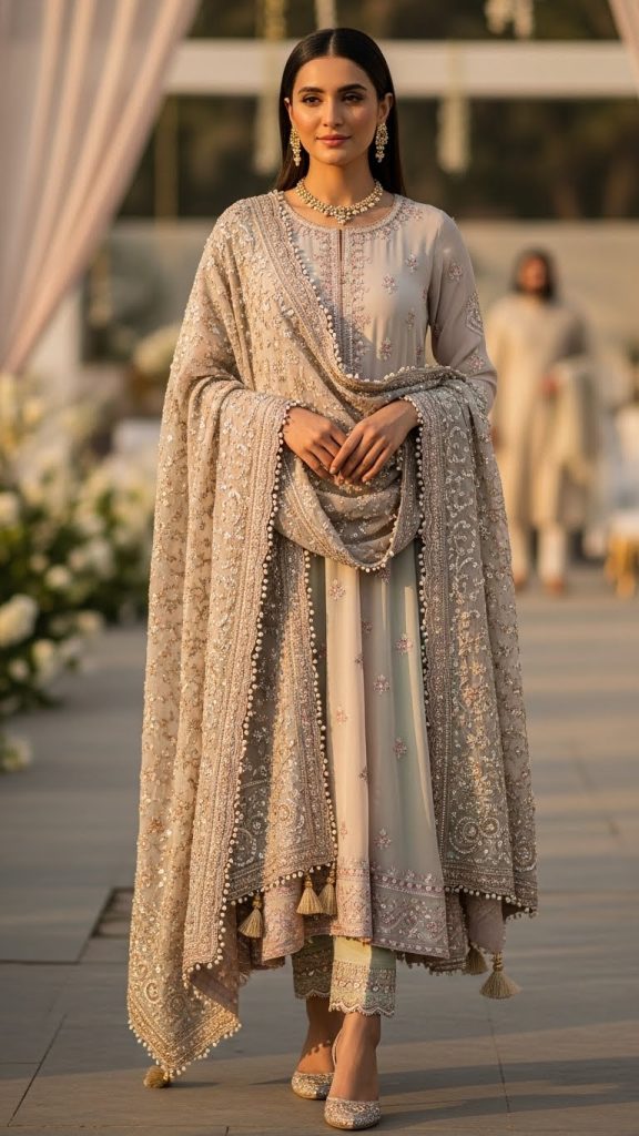 A simple chiffon frock paired with a heavily embellished dupatta creates a balanced luxury style. It looks graceful, modest, and suitable for a variety of festive occasions.