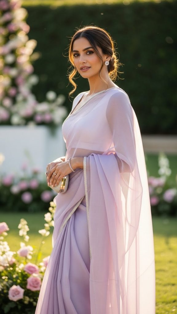 Organza sarees feel feather-light yet formal. A pastel-toned saree decorated with fine crystal borders paired with a sleek blouse makes for a chic, minimalist luxury look — perfect for daytime celebrations.