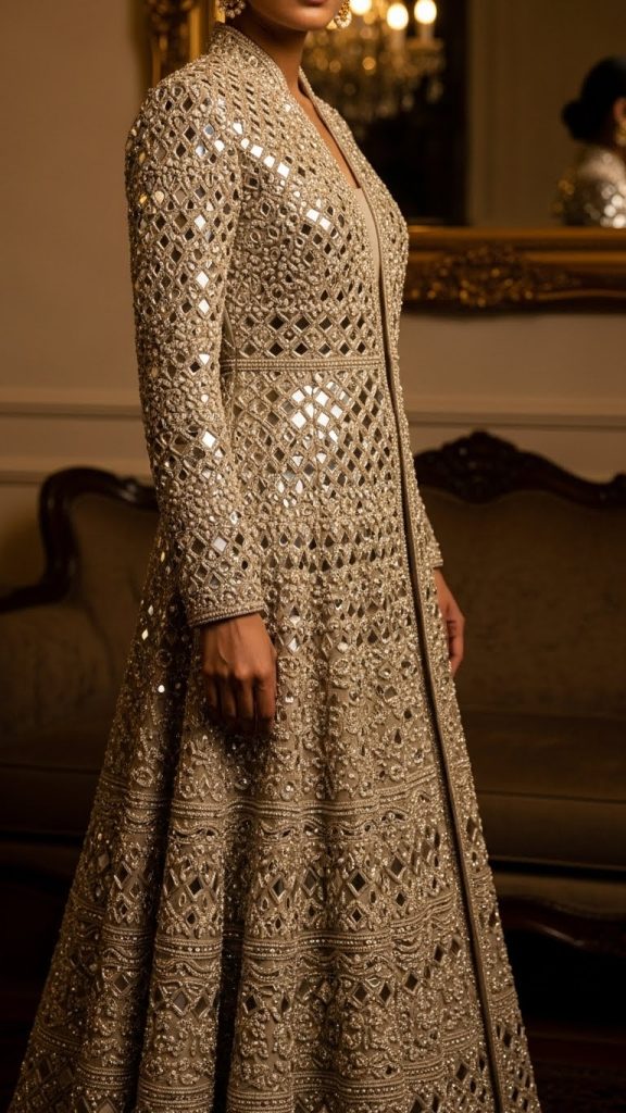 A long embellished jacket worn over a simple inner dress gives a luxury layered effect. Choose mirror work, beads, or hand embroidery for a statement look without being overly flashy.