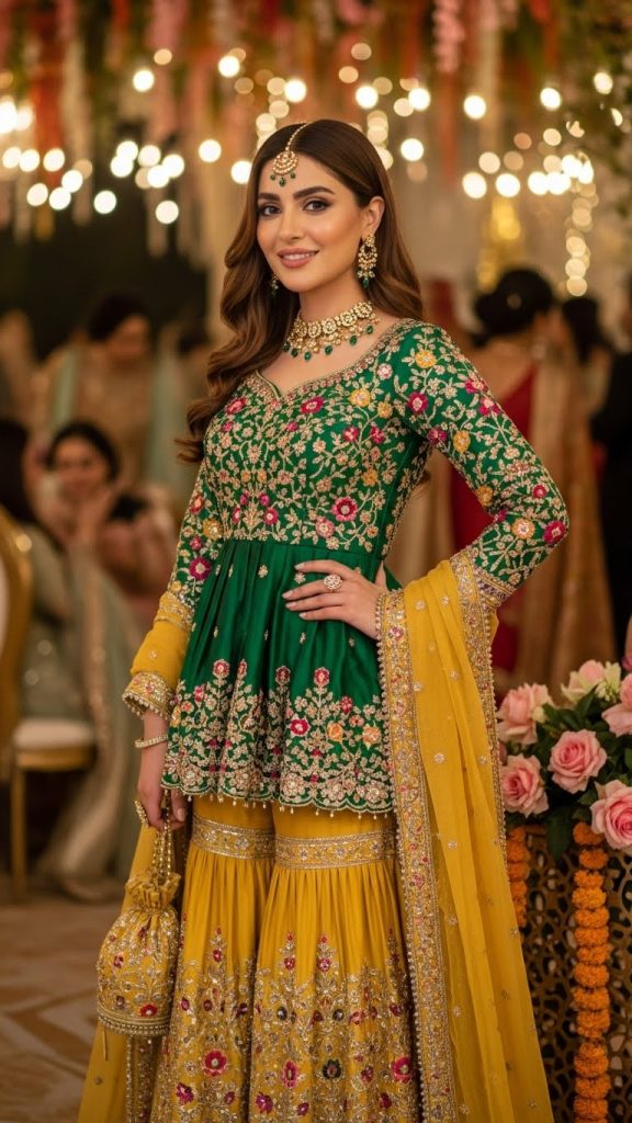 The peplum-and-sharara combination mixes tradition with contemporary flair. Rich embroidery around the peplum hem and wide sharara flare adds a bold yet elegant touch to party wear.
