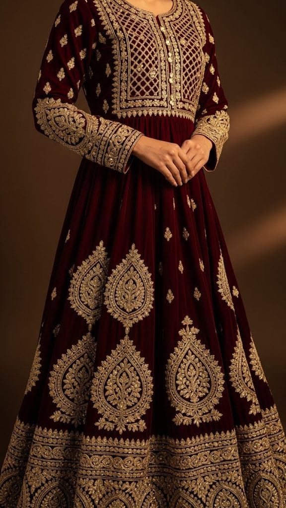 Velvet instantly elevates any outfit. A deep-maroon or bottle-green maxi embellished with gold zari embroidery gives a luxurious winter party look, combining warmth, richness, and traditional elegance.