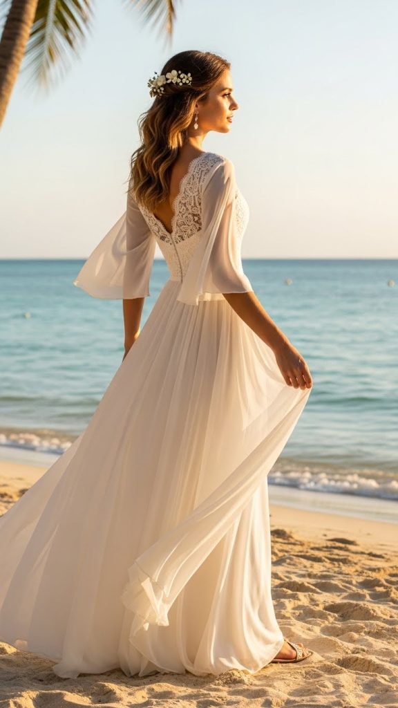 Lightweight doesn’t mean plain. A gown with delicate embellishments like pearl accents, fine thread embroidery, or minimal sequins adds just enough sparkle without making the dress heavy. These subtle details photograph beautifully and suit intimate wedding settings.