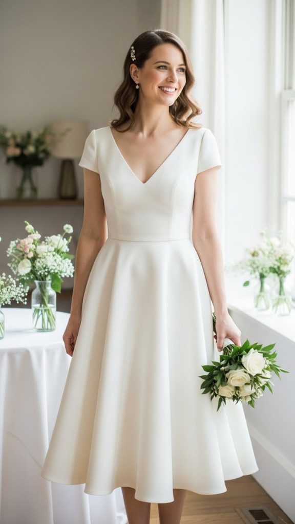 Tea-length bridal gowns are ideal for brides who want something modern and playful. Falling between the knee and ankle, these gowns are comfortable, stylish, and perfect for small daytime weddings. Paired with elegant heels, this look feels fresh and effortless.