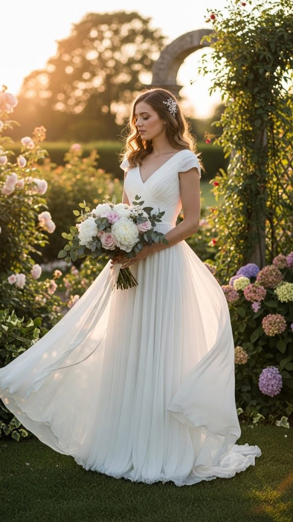 An A-line gown is universally flattering and easy to carry. Designed to be fitted at the top and gently flared at the bottom, this silhouette creates a graceful bridal appearance without excessive fabric. Lightweight tulle, chiffon, or crepe fabrics make this style perfect for intimate wedding settings.