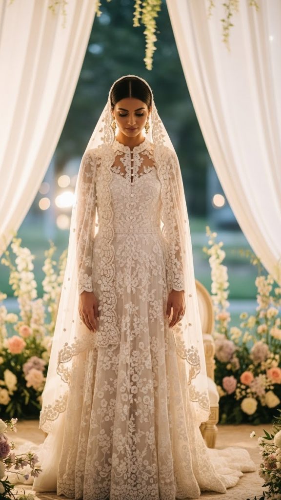 For brides who want a traditional touch, pairing a lightweight gown with a soft dupatta or sheer veil works perfectly. The gown remains simple, while the dupatta or veil adds bridal charm. This combination is especially popular for nikah ceremonies and small family gatherings.