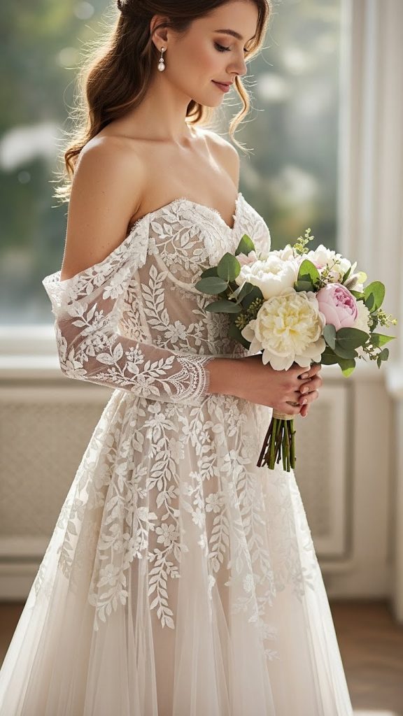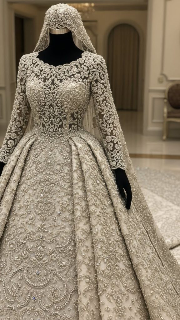 This style becomes even more special when it is handmade. Artisans carefully stitch lace, pearls, crystals, and sequins by hand. Fabrics like silk, satin, tulle, and organza are used to create volume and shine. You can add a sweetheart neckline, corset back, or long sleeves for extra elegance.