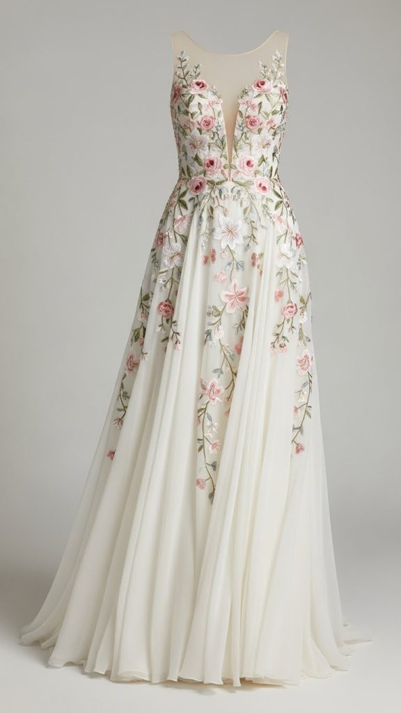 Handmade A-line gowns often feature delicate handwork on the bodice and soft embroidery on the skirt. You can choose chiffon, net, or silk fabric. Adding hand-stitched floral patterns or pearls gives it a soft and romantic feel.