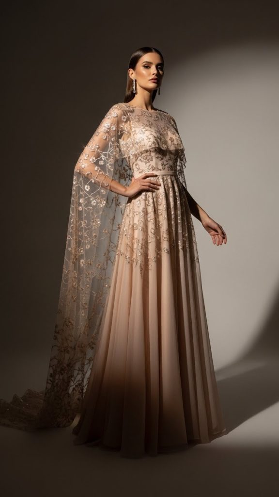 Capes can be made from net, chiffon, or organza with light embroidery or stone work. This style is perfect for women who want something different and classy.