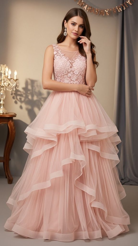 Colors like blush pink, baby blue, mint green, and lavender are trending. These gowns are perfect for birthday parties, engagement events, and evening celebrations.