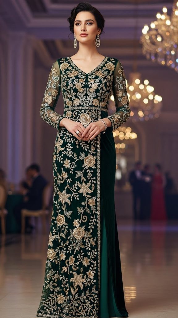 Floral embroidery, geometric patterns, and pearl embroidery are very trendy. These dresses look rich but not too heavy, perfect for ladies who like elegance with comfort.