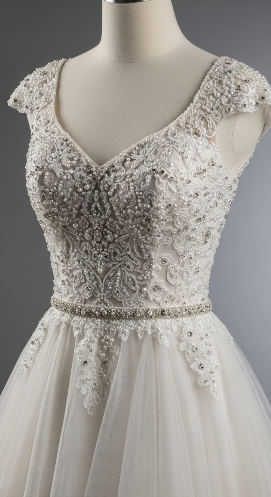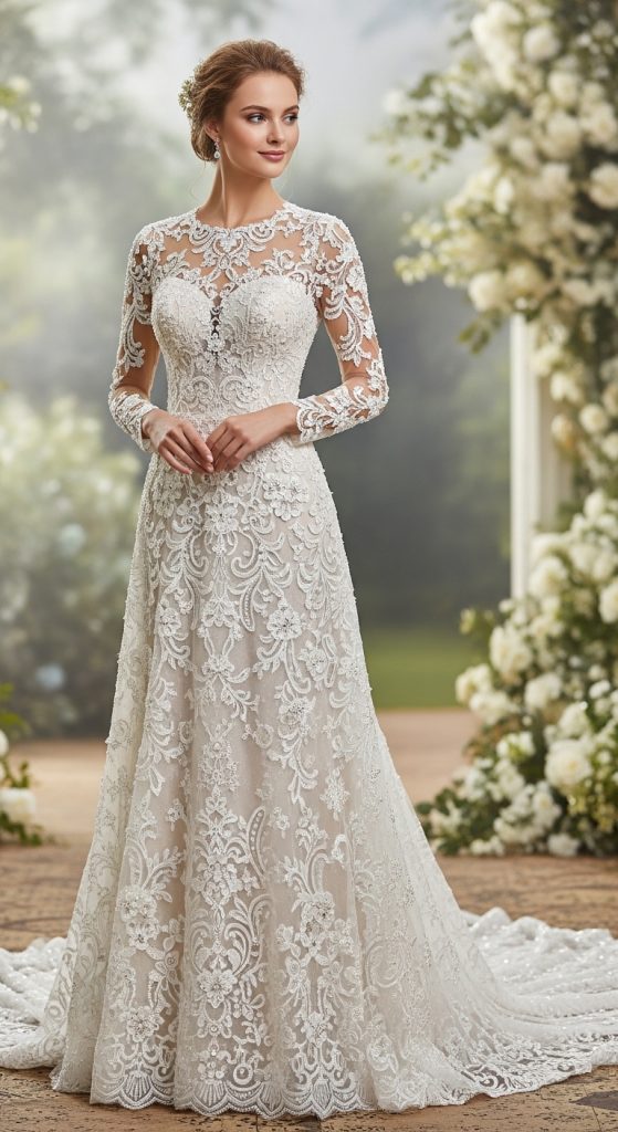 A lace wedding gown becomes even more breathtaking when enhanced with hand beaded details. Beads are often sewn along lace motifs to highlight floral patterns, creating texture and dimension.