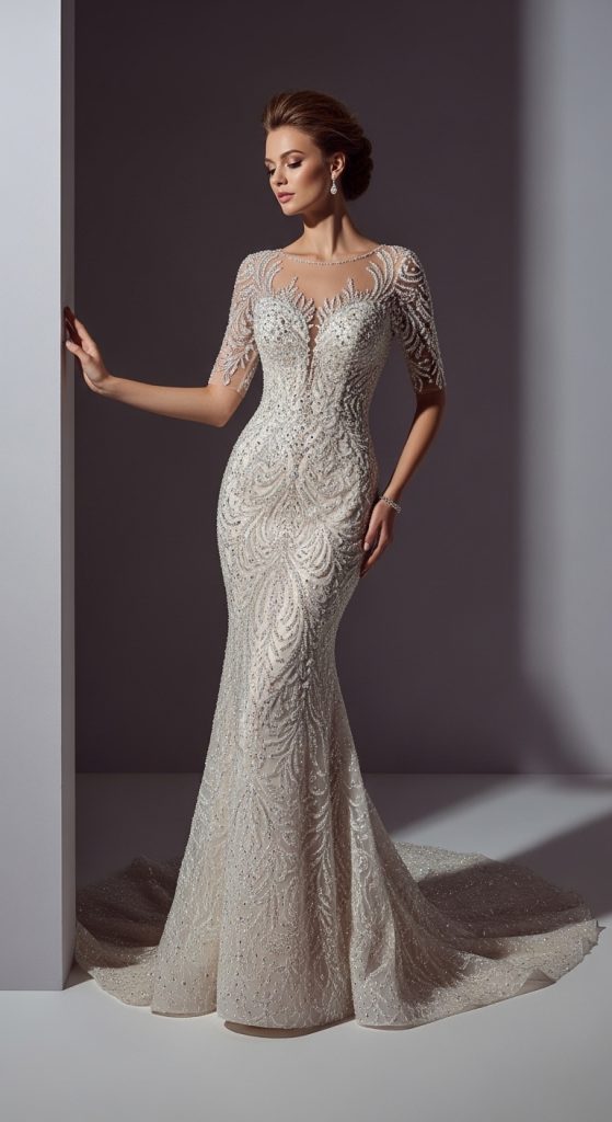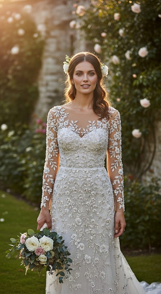 This style is especially popular for winter weddings or formal ceremonies. It balances modesty with glamour, making it a favorite among brides seeking elegance and comfort.