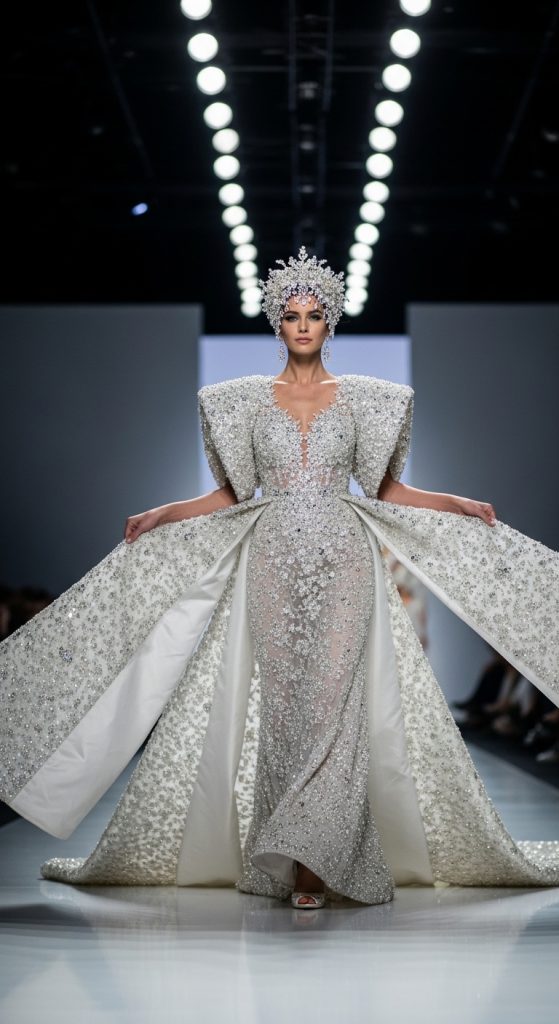 A couture hand beaded wedding gown is a true work of art. These gowns feature custom designs with heavy beadwork, unique patterns, and luxurious fabrics like silk, organza, or tulle.