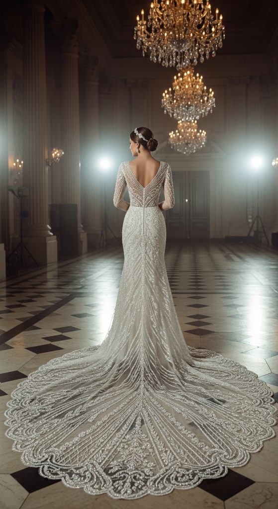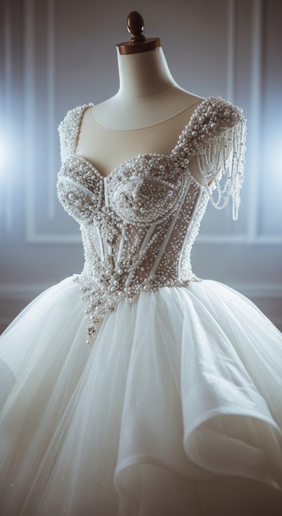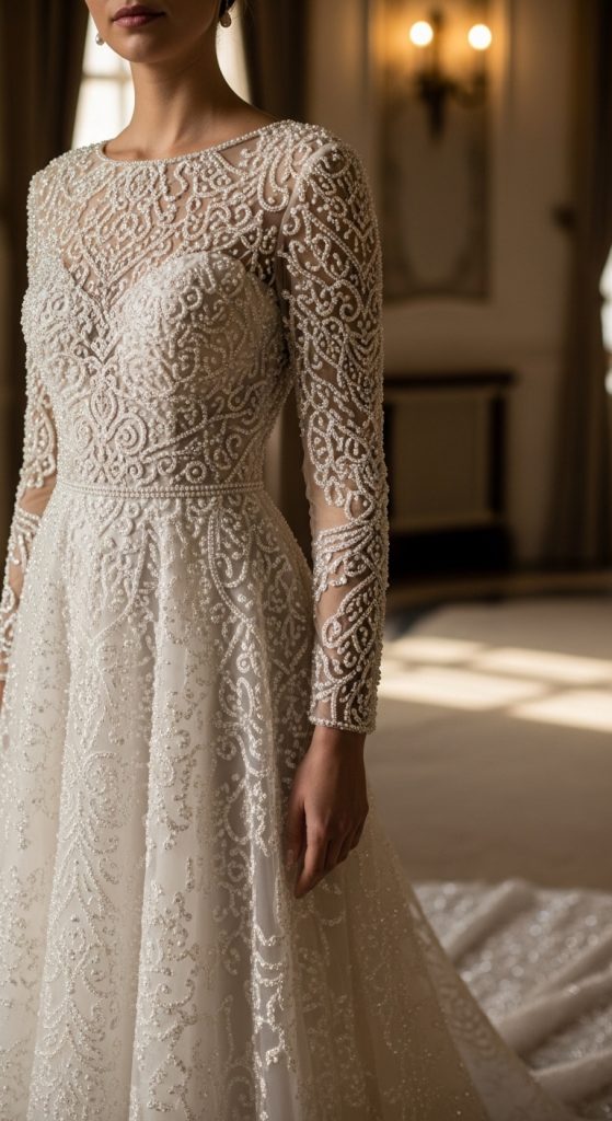 Vintage-inspired wedding gowns with pearl hand beading bring old-world charm into modern bridal fashion. Soft ivory or champagne fabrics paired with delicate pearl patterns create a romantic and graceful look.