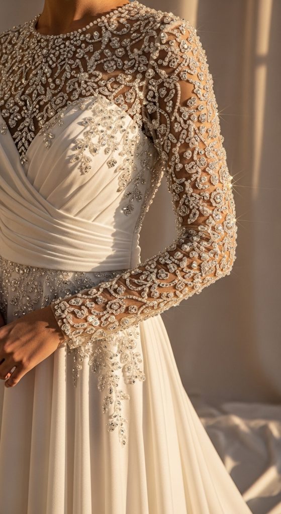 Long sleeve wedding gowns with hand beaded details offer a regal and sophisticated look. Beads are often applied along the sleeves, cuffs, and bodice, creating a cohesive and luxurious design.