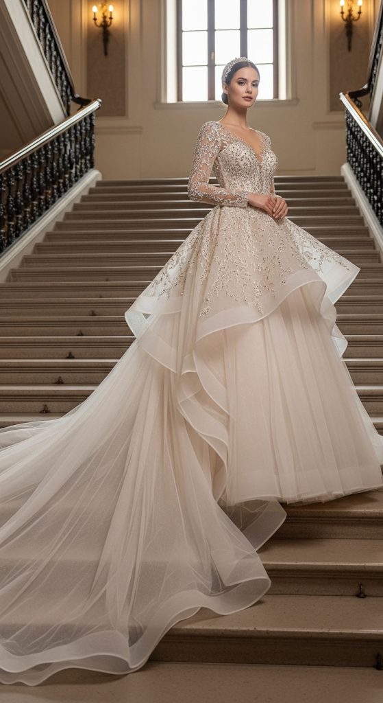 A ball maxi with crystal handwork adds a sparkling touch to a bridal look. The bodice can feature dense crystal embroidery, gradually fading towards the hem, creating an elegant gradient effect. Pair this with a long flowing train for a dramatic entrance. Soft tulle layers with scattered crystals add dimension and luxury.