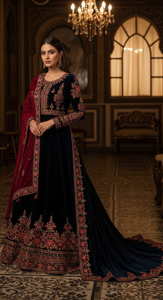For winter weddings or luxurious indoor settings, a velvet bridal maxi with detailed handwork is unmatched. Rich fabrics like velvet provide a stunning base for hand embroidery, crystals, and zardozi patterns. The heavy work on the bodice paired with a flowing velvet skirt gives a royal feel. Deep jewel tones or classic ivory enhance the elegance and create a dramatic impact.