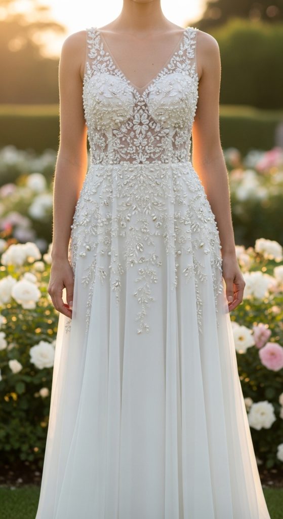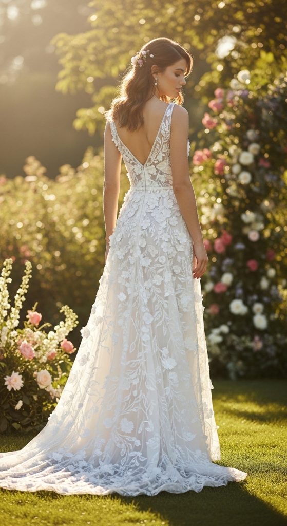 The 3D appliqué maxi brings texture and depth to bridal wear. Using hand-sewn floral appliqués with beads or sequins, designers create a lifelike floral effect. This style is particularly popular for outdoor or garden weddings, as the dress reflects natural beauty while maintaining opulence. A fitted bodice with a flowing skirt ensures a graceful silhouette.