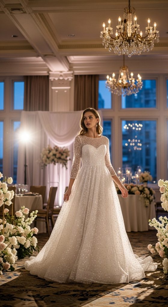 For brides who love sparkle, a sequined tulle maxi is ideal. Layers of soft tulle with hand-stitched sequins catch the light beautifully, making every movement shimmer. Pairing this with subtle embroidery around the neckline or sleeves ensures the maxi remains luxurious without being overpowering. A long flowing train adds extra drama.