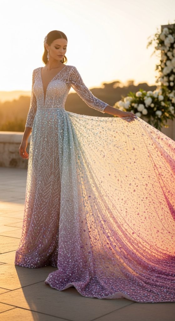 The ombre crystal maxi features a gradient of colors or embellishments along the dress. Starting with dense crystals at the bodice that gradually lighten towards the hemline, this style is visually stunning. Handwork with crystals and sequins in this gradient manner creates a soft, romantic effect, making it perfect for evening wedding ceremonies.