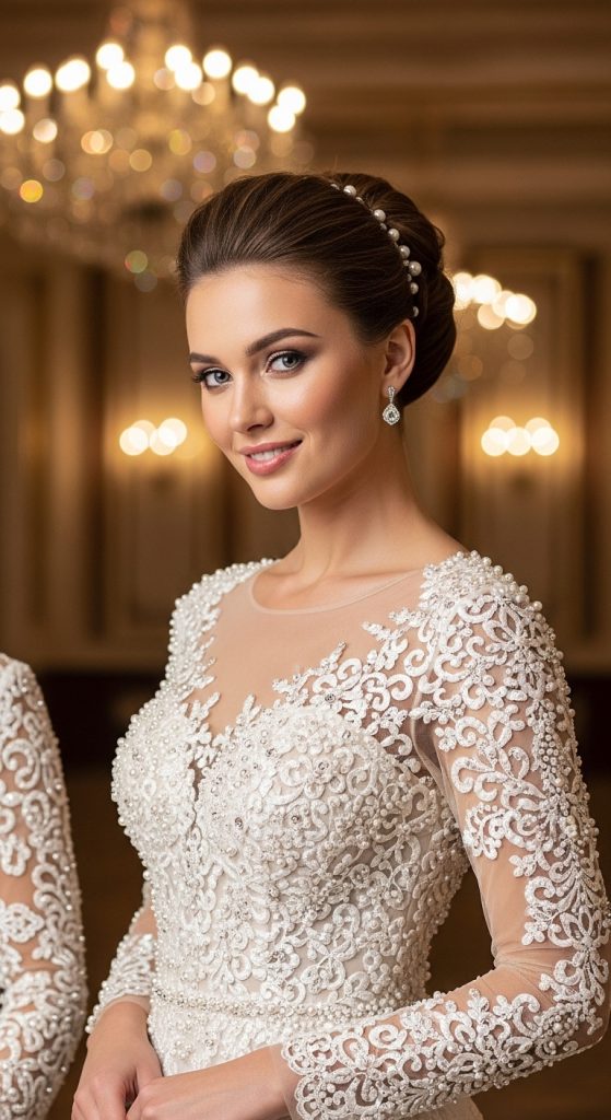 Crystal and pearl combination is a symbol of bridal sophistication. Pearls add softness, while crystals add sparkle, creating a balanced luxurious effect. This maxi can feature dense pearl and crystal embroidery on the bodice and sleeves, gradually transitioning into scattered motifs along the skirt. A soft A-line silhouette ensures elegance and ease of movement.