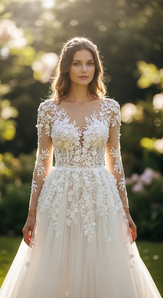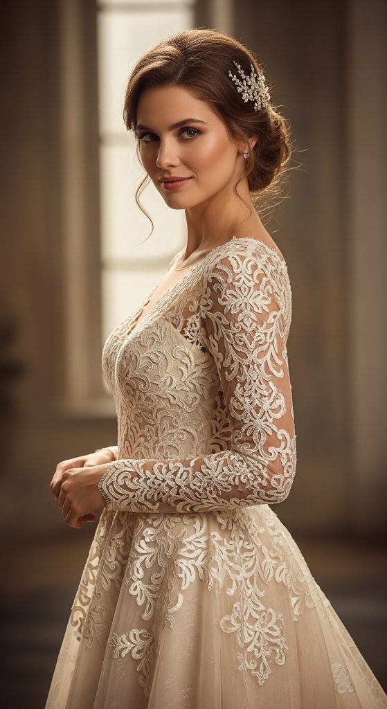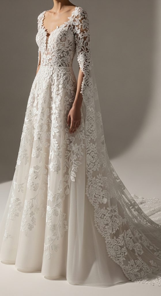 A hand-embroidered lace wedding dress is a classic choice for brides who love timeless romance. Skilled artisans carefully embroider floral or vine motifs onto fine lace fabric, creating depth and texture. This style looks especially stunning on long sleeves, illusion necklines, and flowing skirts. The handcrafted embroidery adds softness and elegance, making the bride look graceful and refined.