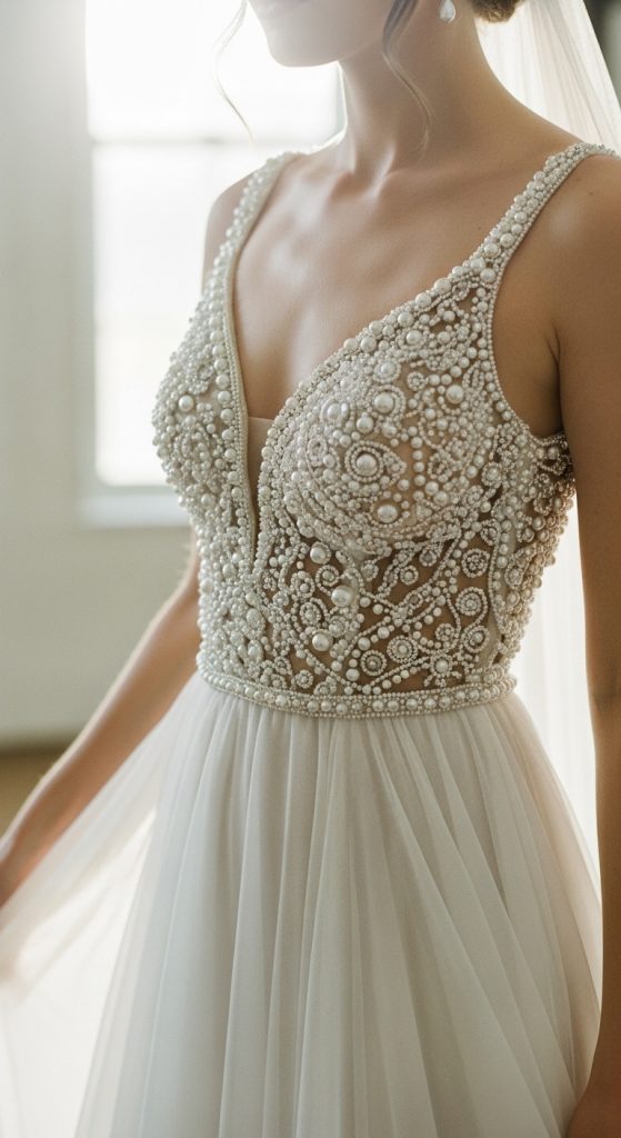 Hand-beaded wedding gowns are perfect for brides who want subtle sparkle without overpowering the design. Tiny beads, pearls, and crystals are sewn individually by hand, ensuring precision and durability. These gowns catch the light beautifully as the bride moves, creating a magical glow. Hand-beaded details work well on bodices, waistlines, and train borders.