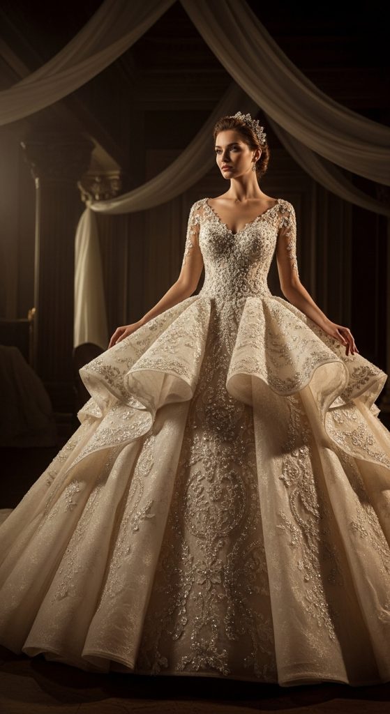 For brides dreaming of a fairytale wedding, a hand-embellished ball gown is an excellent choice. Layers of fabric are decorated with hand-placed beads, embroidery, or sequins. The voluminous skirt and fitted bodice create a dramatic yet graceful silhouette. Handcrafted embellishments elevate the gown to a true statement piece.
