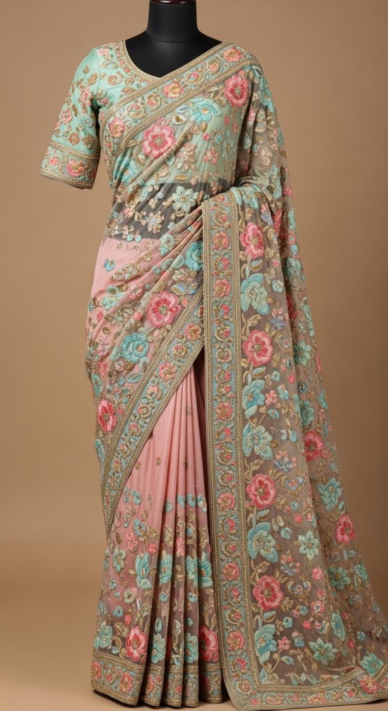 Floral hand embroidery never goes out of style. Luxury wedding sarees featuring handcrafted floral motifs symbolize femininity and romance. Whether done in resham, beads, or zari, floral designs bring freshness to bridal looks.
