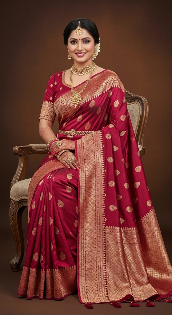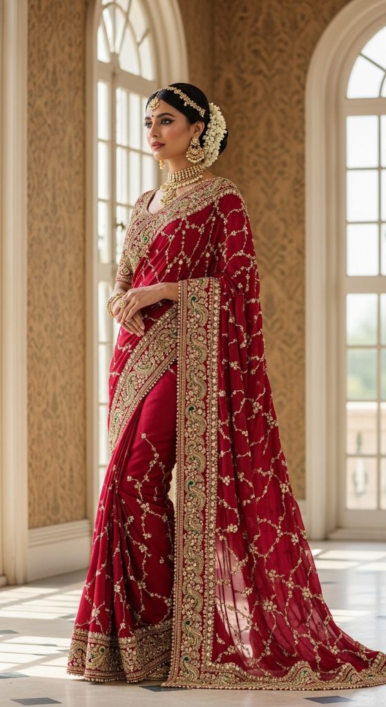 Zardozi embroidery is synonymous with royalty. A silk wedding saree adorned with rich zardozi handwork using gold and silver threads creates a majestic bridal look. These sarees often feature floral and Mughal-inspired motifs, making them ideal for traditional wedding ceremonies.