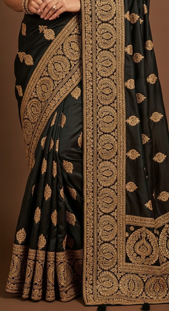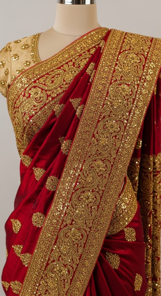Antique gold hand embroidery gives wedding sarees a vintage and heritage-inspired appeal. This style works beautifully on deep-toned fabrics like maroon, wine, emerald, or navy blue. Brides looking for a classic royal aesthetic often prefer this design.
