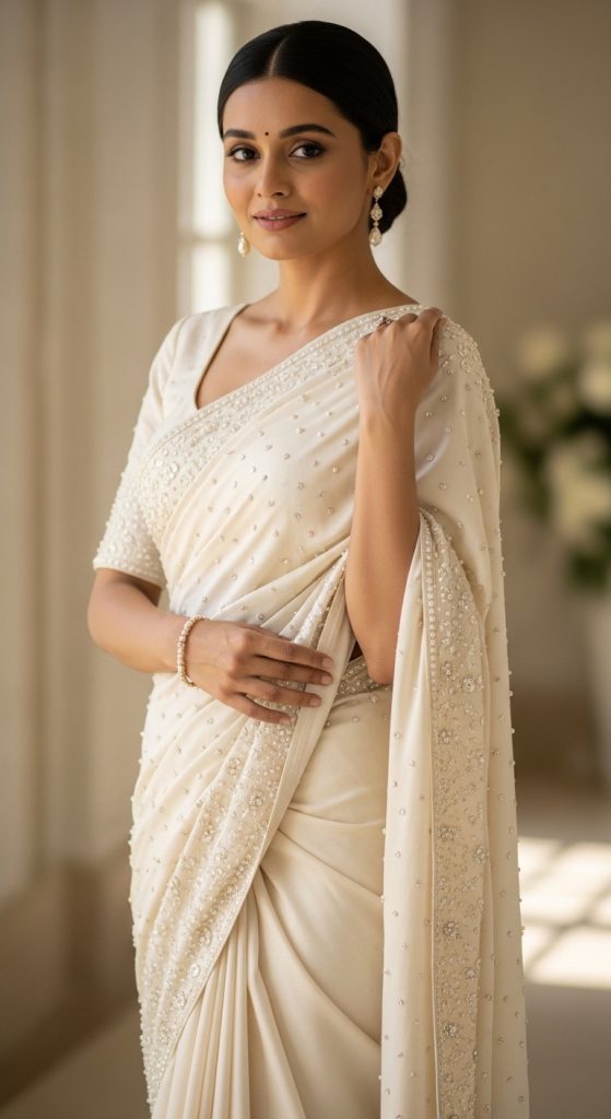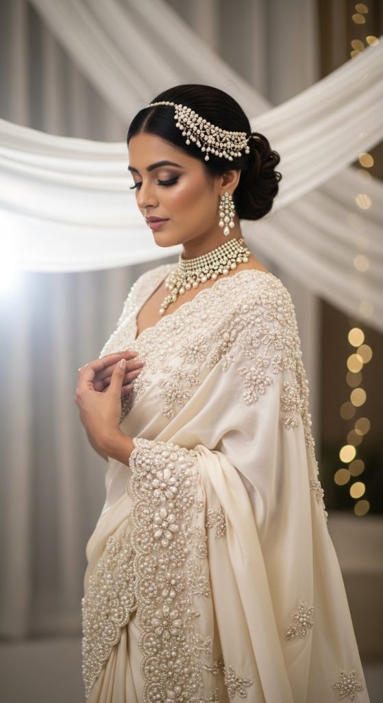 Pearl and stone handwork adds a soft yet luxurious glow to bridal sarees. These sarees are ideal for brides who want understated elegance with subtle sparkle. Pastel shades and ivory bases enhance the delicacy of this handwork style.