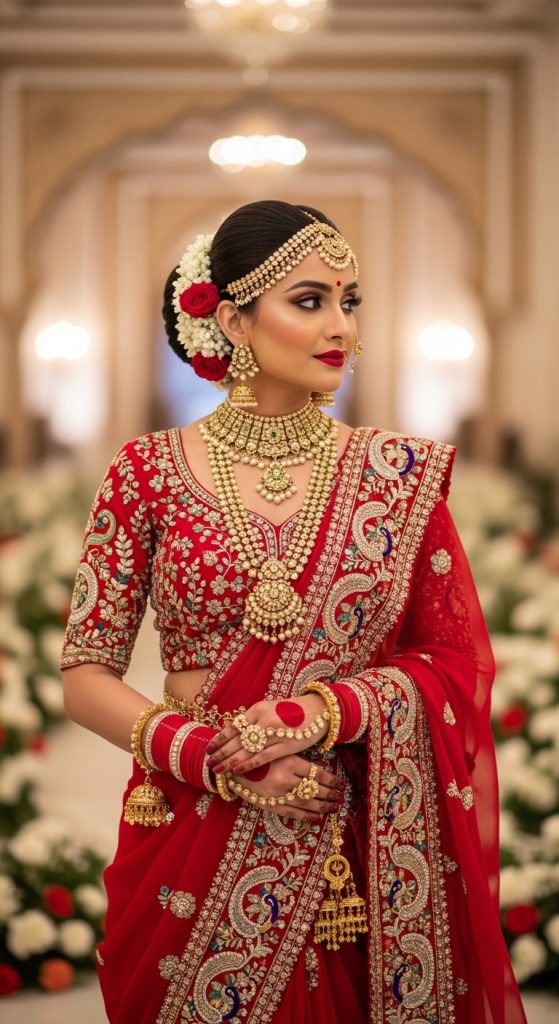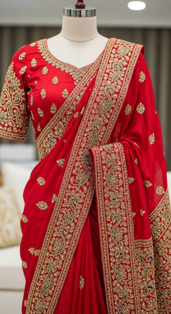 For brides who want exclusivity, couture handworked wedding sarees are custom-made masterpieces. These sarees combine multiple hand embroidery techniques, premium fabrics, and personalized detailing, ensuring a one-of-a-kind bridal outfit.