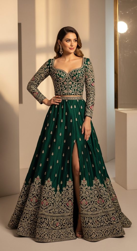 For brides who want to blend elegance with a hint of boldness, a high slit reception gown is an excellent option. The slit adds movement and allows ease of walking while enhancing the gown’s modern appeal. Paired with heels and minimal jewelry, this style creates a confident and fashion-forward bridal look.