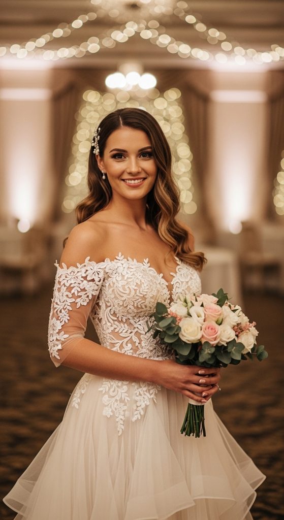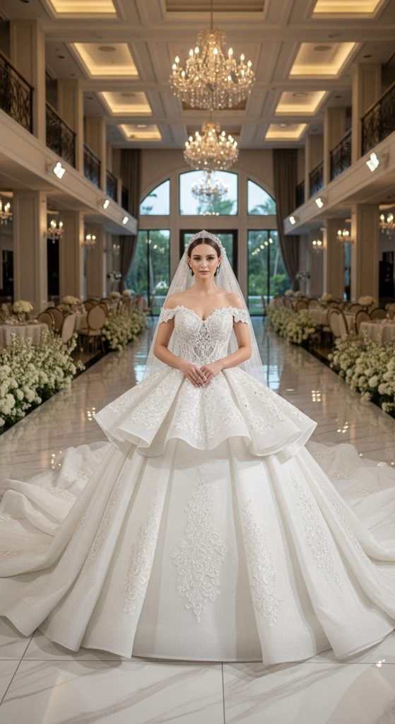 Off-shoulder gowns add a romantic and feminine touch to any reception look. This style beautifully frames the shoulders and collarbones, creating an elegant yet soft appearance. Off-shoulder reception gowns often feature lace detailing, beadwork, or delicate embroidery on the neckline, making them a favorite for brides who want a graceful and charming look.