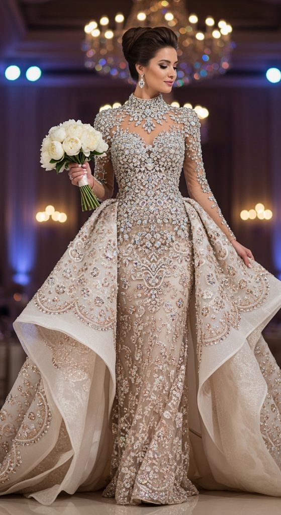 A heavily embellished reception gown is perfect for brides who love luxury and sparkle. These gowns feature intricate hand embroidery, beads, sequins, pearls, and crystals. Rich fabrics like velvet, net, or silk are commonly used to enhance the royal feel. This style is ideal for evening receptions where lighting enhances the shimmer of the gown.