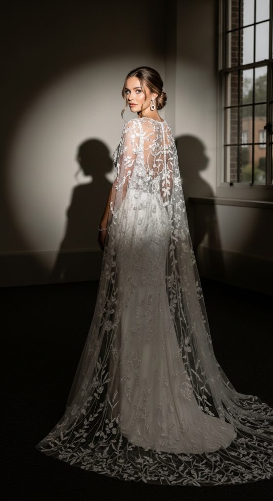 Cape-style reception gowns are a unique and fashionable choice for brides who want something different. Instead of a traditional dupatta or veil, a flowing cape is attached to the gown, adding drama and movement. Capes can be sheer, embroidered, or embellished, instantly elevating the overall look. This style is perfect for modern brides who love runway-inspired fashion.