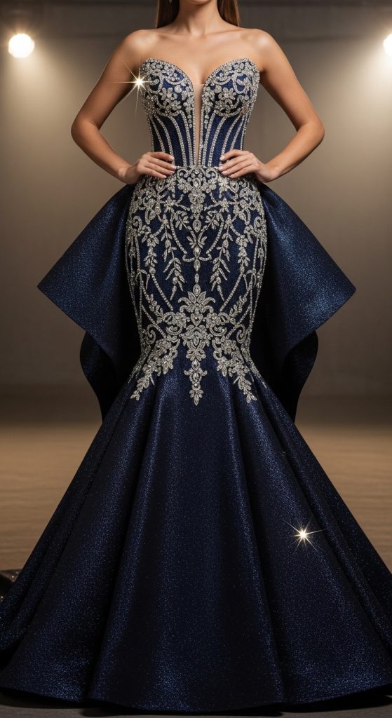 Mermaid gowns are designed for brides who want to make a bold and glamorous statement. Fitted tightly through the bodice and hips, the gown flares dramatically at the knees or lower legs. This style highlights curves beautifully and looks stunning with heavy embellishments, sequins, or crystal embroidery. Mermaid reception gowns are ideal for evening receptions with a luxurious theme.