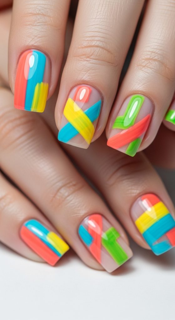 Abstract nail art allows you to play with shapes, colors, and textures freely. Use bright summer colors like coral, turquoise, yellow, and lime green. You can create splashes, brush strokes, blocks of color, or asymmetrical patterns. Abstract nails are perfect for fashion-forward individuals who want to make a bold statement.