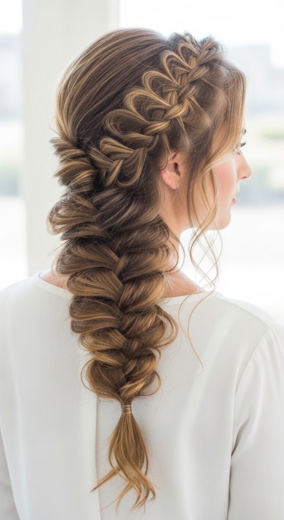 To create it, sweep all your hair to one side and braid it loosely. Secure the end with a small hair tie. You can gently pull the braid to make it look fuller and more stylish.