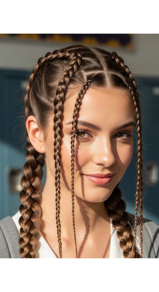Part your hair in the middle and create two braids on each side. This hairstyle is comfortable and perfect for sports days or busy schedules.