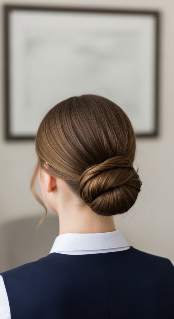 Simply tie your hair into a low ponytail and twist it into a bun at the back of your neck. Secure it with a hair tie or bobby pins. This hairstyle looks clean and polished while still being very easy to create.