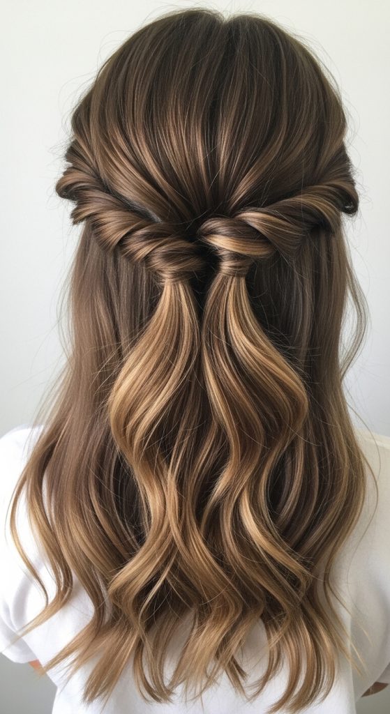 Take two small sections from the front of your hair, twist them backward, and secure them together at the back of your head. The result is a simple yet elegant hairstyle that looks great for school.