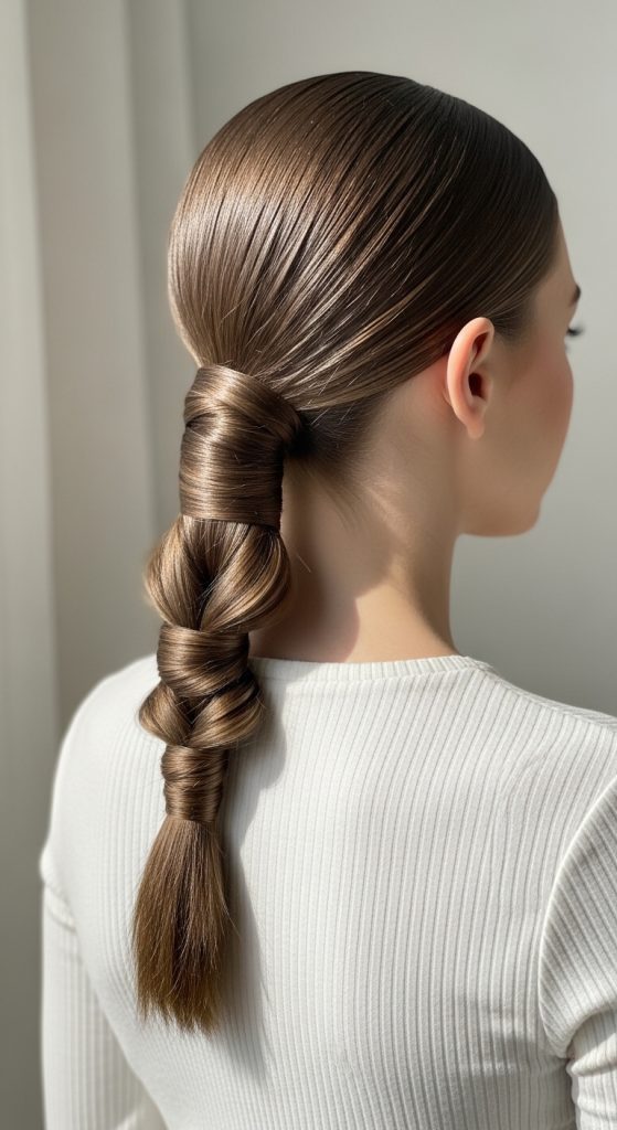 Tie your hair into a low ponytail and wrap a small section of hair around the hair tie. Secure it with a bobby pin. This small detail instantly upgrades a basic ponytail into a more polished look.