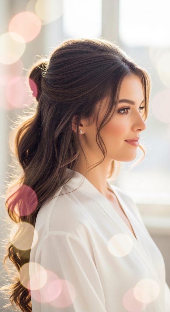 Take the top section of your hair and tie it into a small ponytail or bun while leaving the rest of your hair loose. The half-up half-down style gives a cute and relaxed look that works well for everyday school wear.