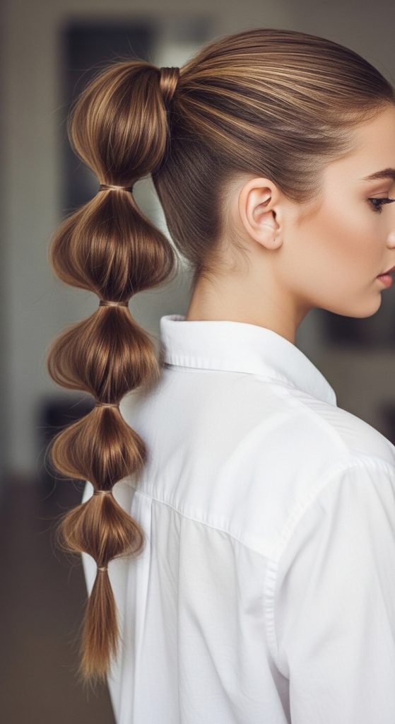 Start with a normal ponytail and add additional hair ties every few inches. Then gently pull each section to create a “bubble” effect. This hairstyle looks unique and stylish while still being easy to do.