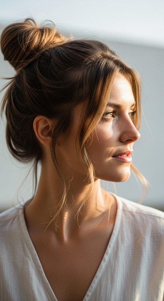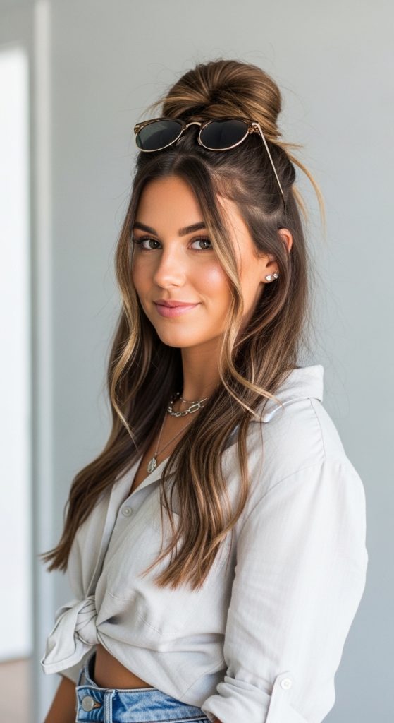 The half-up top knot is a trendy and practical option. It allows you to keep some hair down while pulling the top section away from your face. This style strikes the perfect balance between casual and chic.